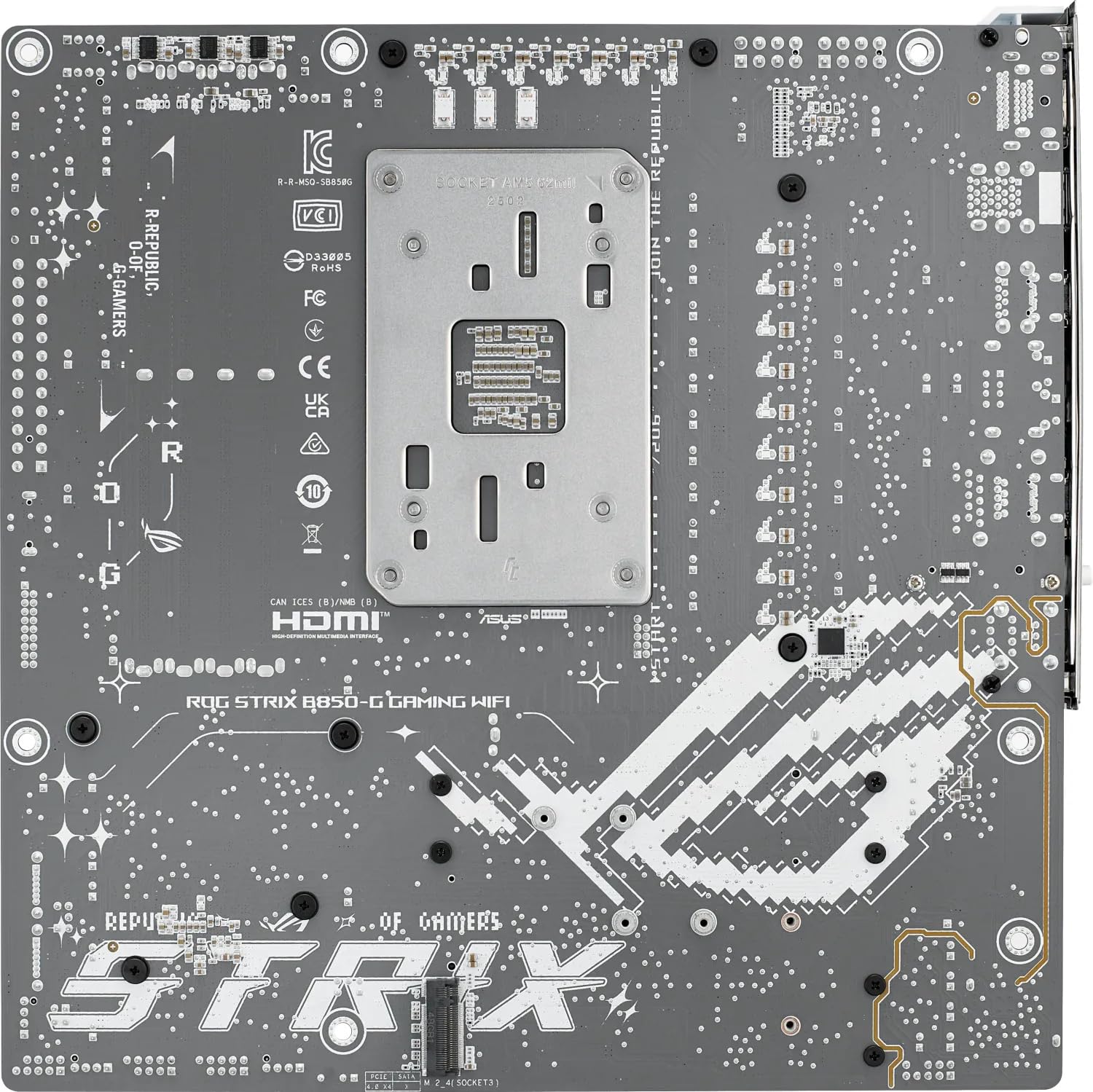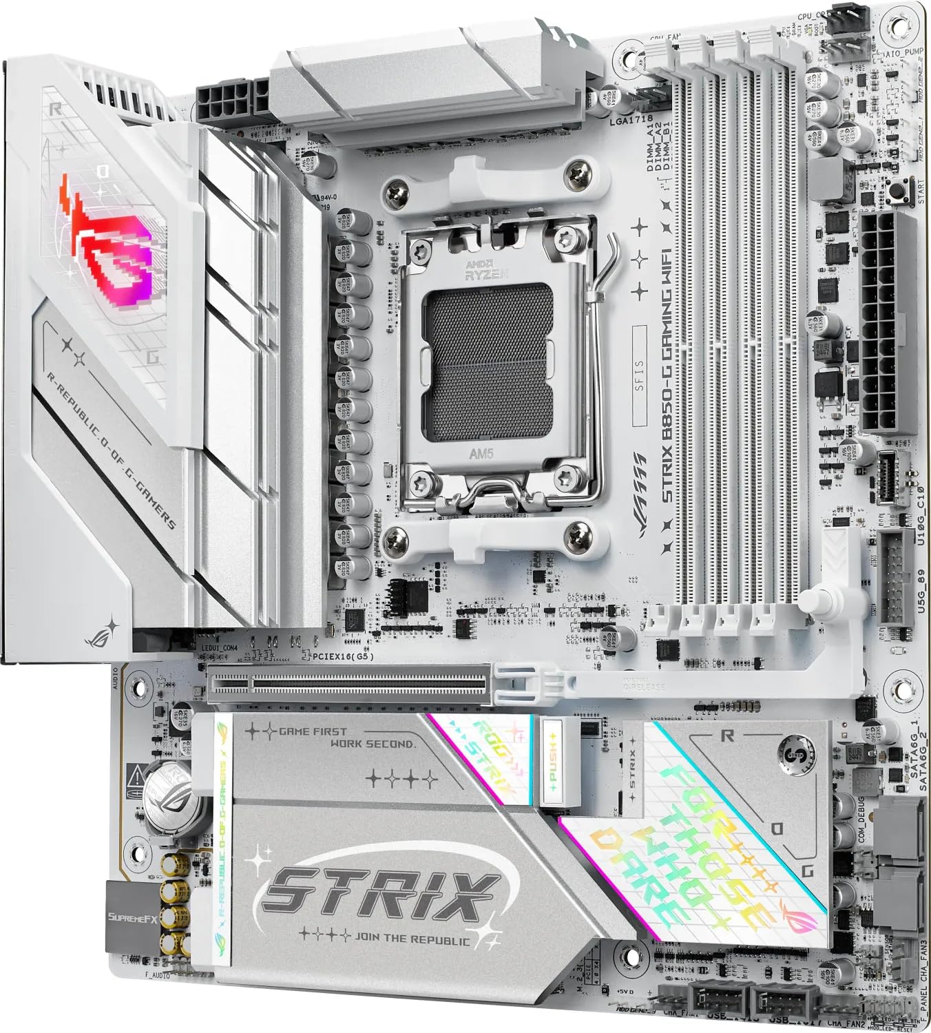 View all available images of ASUS ROG Strix B850-G Gaming Wi-Fi AMD mATX Motherboard, 14+2+1 Power Stages, DDR5, PCIe 5.0 Slots, 4 M.2 Slots, Wi-Fi 7 (802.11be) and 2,5 Gb Ethernet, 20 Gbps USB-C, Aura Sync RGB, White