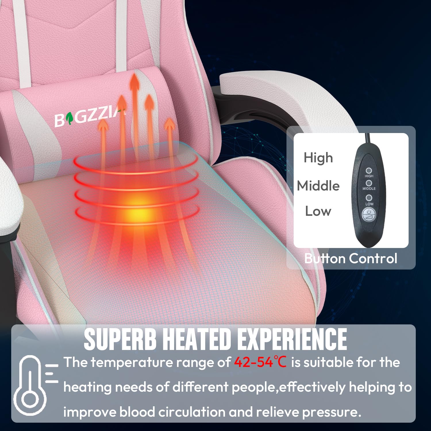 - 【Comfortable Heated Gaming Chair】 The bigzzia heated gaming chair is specially designed for sedentary people prone to lower back pain. The adjustable heating function accelerates fatigue relief and makes you feel warm when you are alone or late at night.