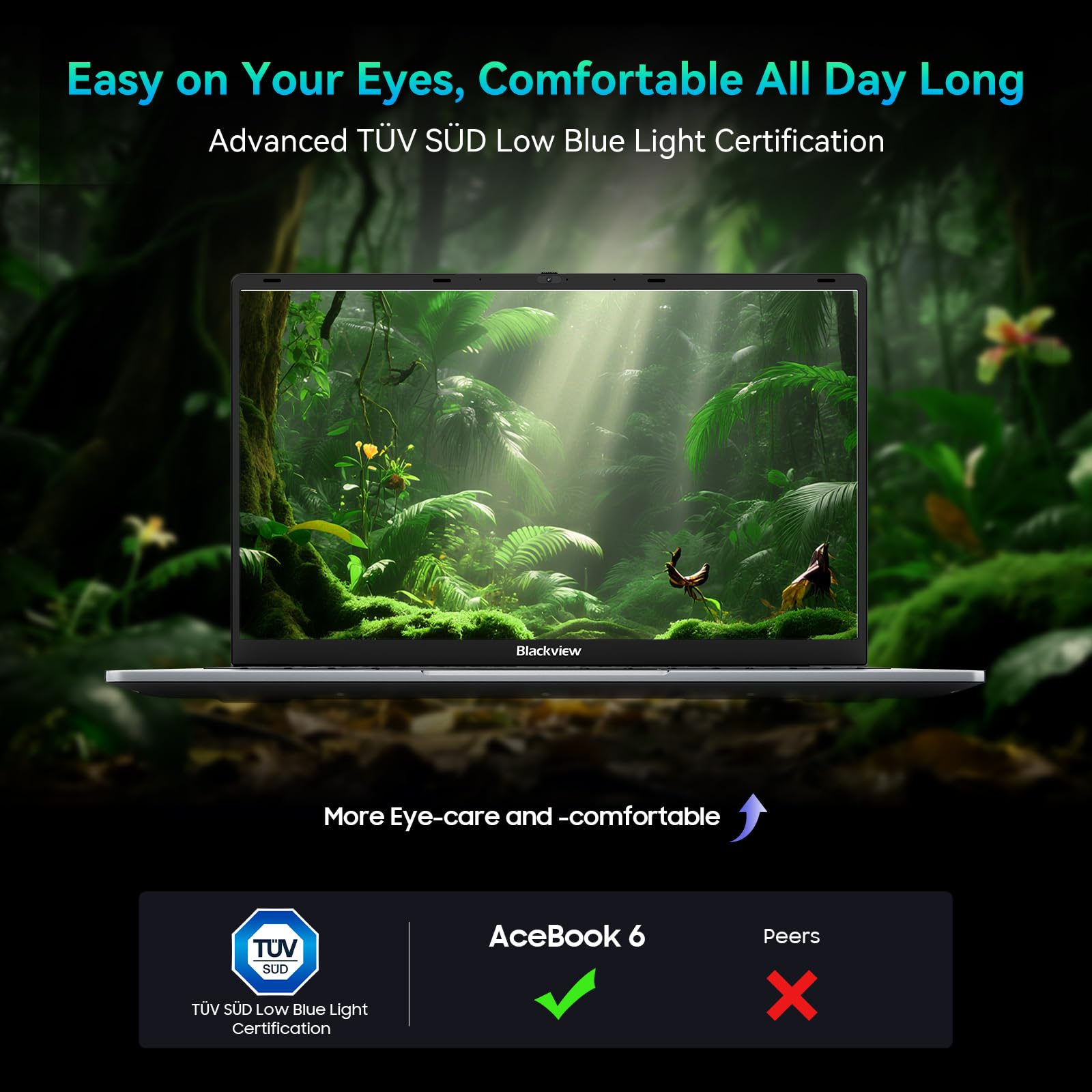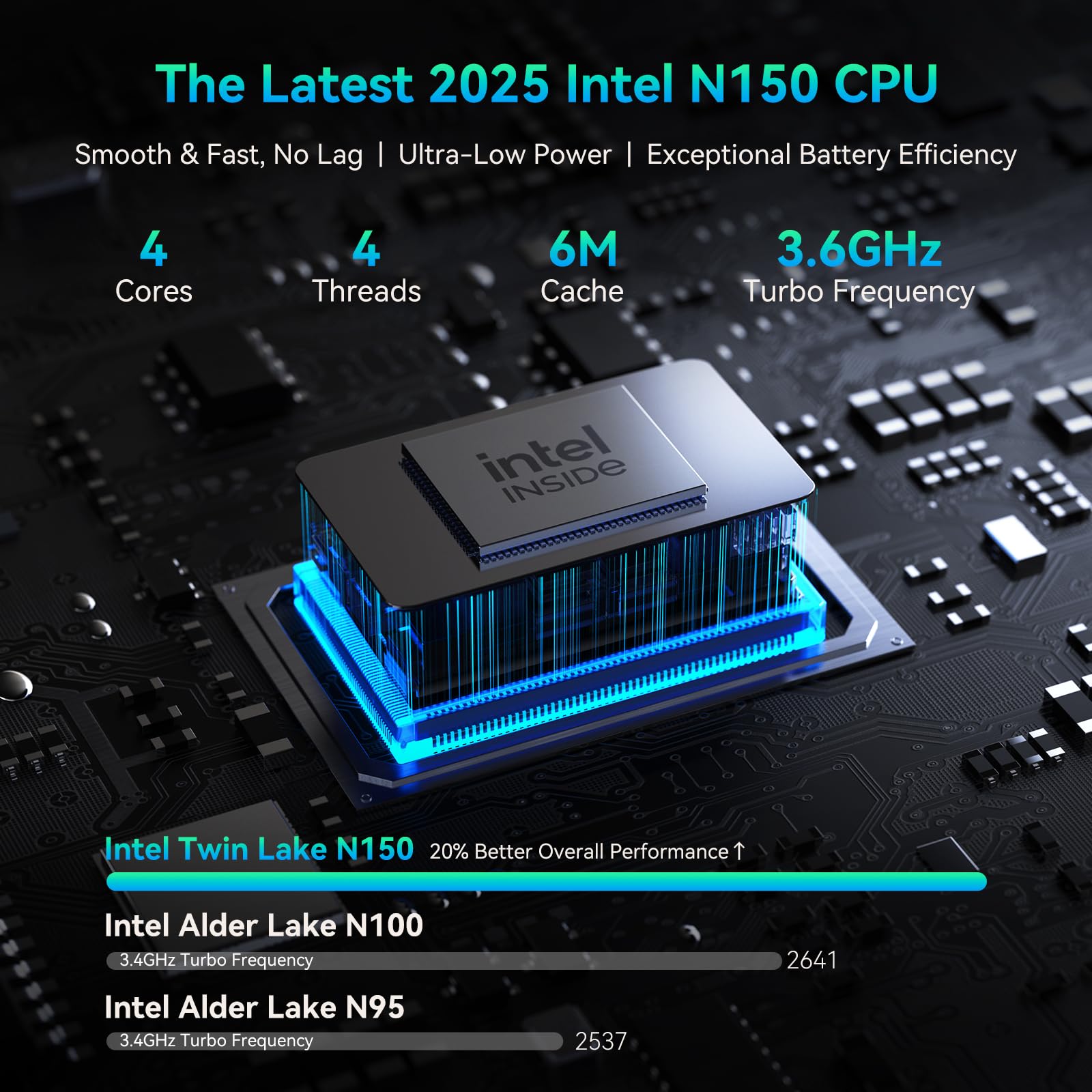 - 【Powerful Performance】 The Blackview Acebook6 laptop is powered by the 2025 Intel N150 processor (4 cores, up to 3.6GHz, 6MB Cache), engineered for real-world speed and efficiency. With Intel 10nm ultra efficient architecture, it delivers 20% faster multitasking and graphics performance than N4020/J4005/J4105/N5095/N95/N97/N100 laptops. The laptop computer effortlessly handles office tasks, online classes, and streaming. The 6W low-power design ensures long battery life while running cool and quiet, eliminating lag. Ideal for business professionals and students.