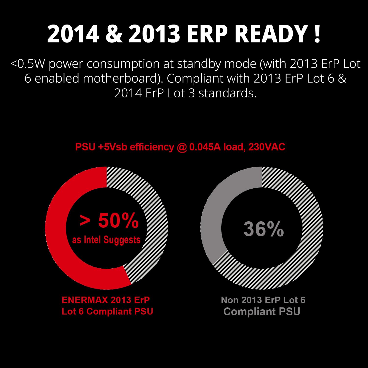- Efficiency: over 87% efficiency at 230VAC between 20 and 100% load with international energy saving certificate 80PLUS. A highly efficient 5 volt standby rail helps to comply with the EU Ecodesign Directive 2013 ErP Lot 6 and 2014 ErP Lot 3 for computer systems (< 0.5W in standby mode*). It also supports EU regulation for computer systems no. 617/2013 (requirement of 85% efficiency at 50% load, as well as 82% at 20% and 100% load)