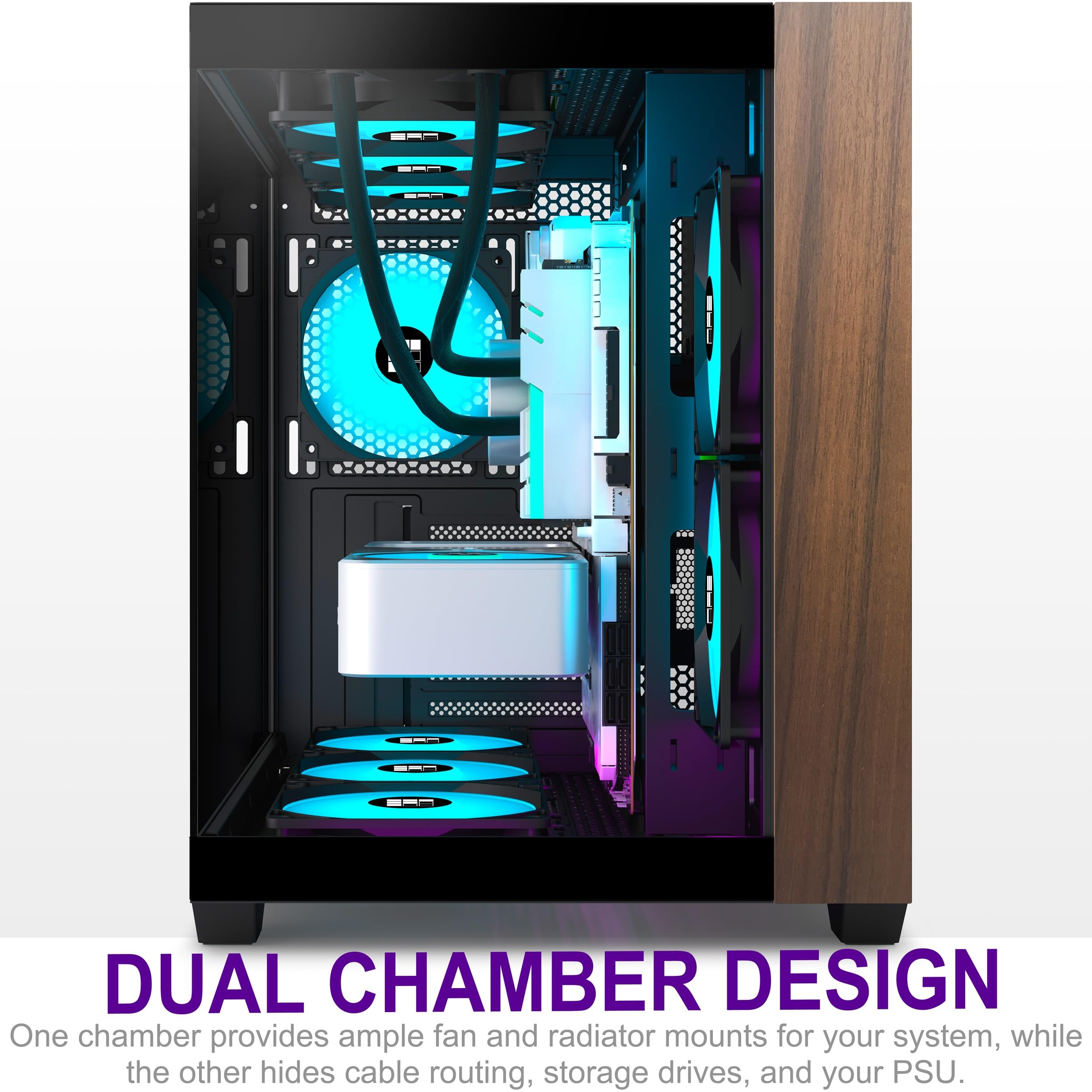 - 【Green Design with Wood Elements】Wood elements are combined with metal for a natural and elegant look. Wood elements are perfectly integrated into the modern workspace, and the 270° double-cabin glass curtain wall design enhances the appearance of the gaming station, bidding farewell to mediocrity.Computer case size: 16.54*11.61*14.49 IN (LWH)