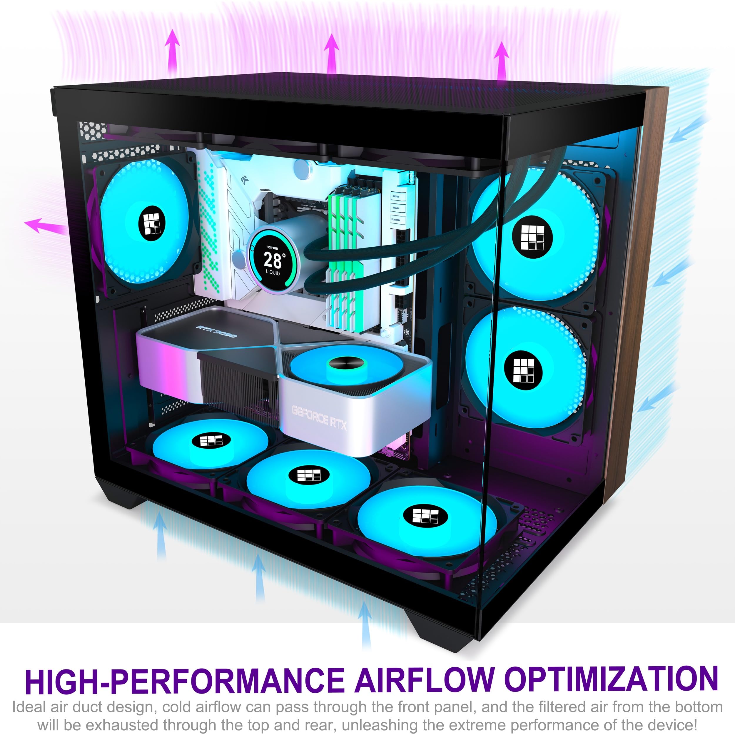 Accommodates even the longest RTX 4090 models with 50mm+ clearance to spare. No front radiator interference with cards up to 360mm.