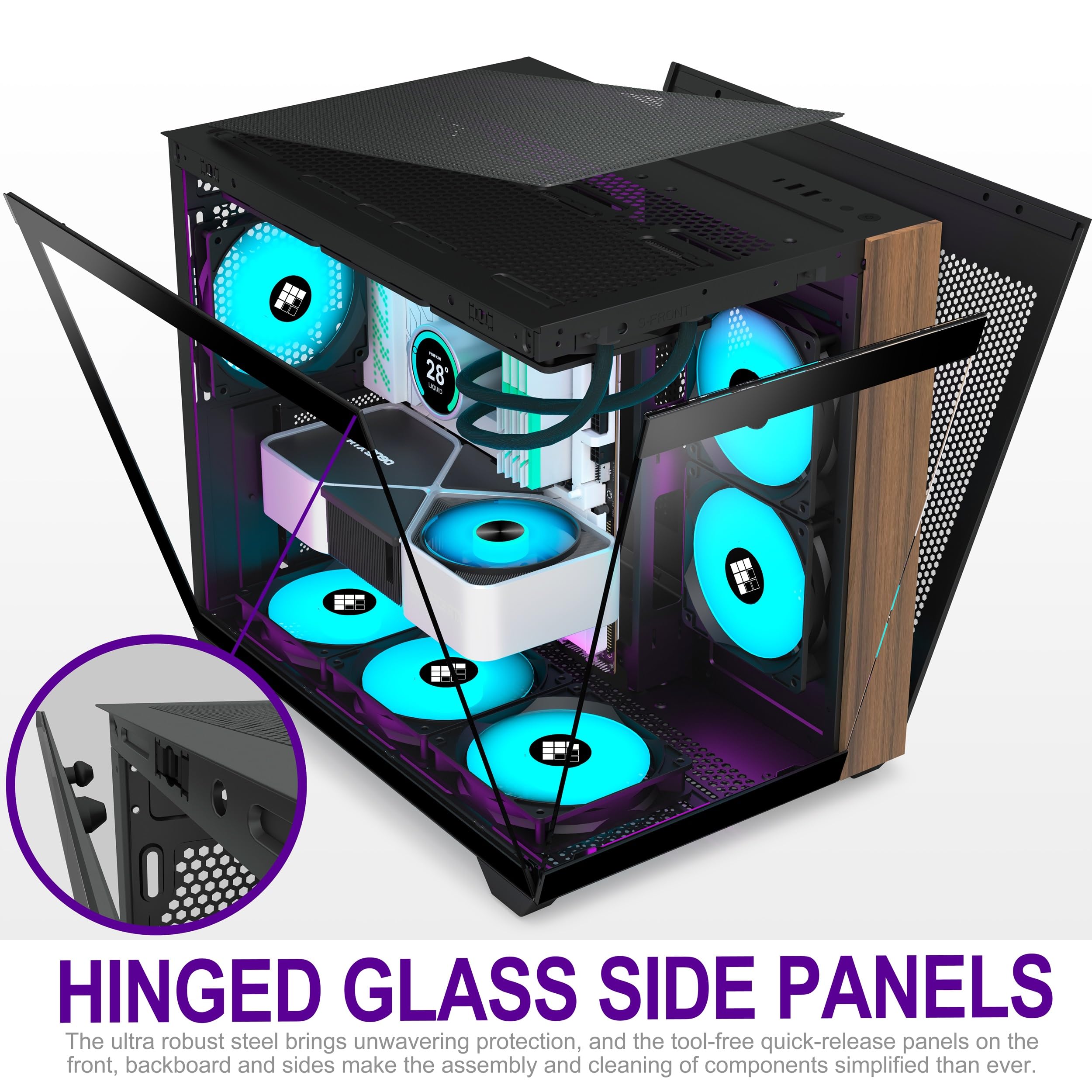 - 【High Performance Cooling】 The M3 comes with 3 pre-installed ARGB PWM fans (2 reverse fans and 1 forward fan), and the glass side panels have a snap-on design that allows for quick and tool-free removal, making for a convenient installation and cooling experience. The sides, top, and PSU fan mounting points of the case can accommodate up to 9 120mm fans, ensuring that you won't have to sacrifice cooling for the stunning look of the glass panel.