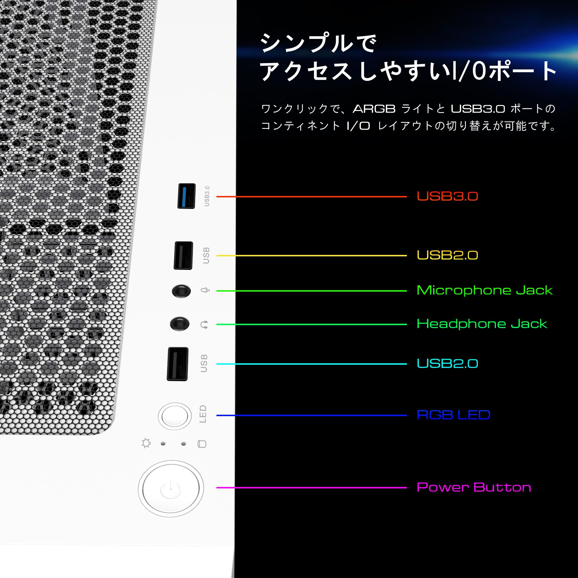 - EASY AND ACCESSIBLE The I/O is equipped on the top front of the case, with 2 x USB ports, 1 x USB 3.0 port, LED lighting control and additional audio connectivity.
