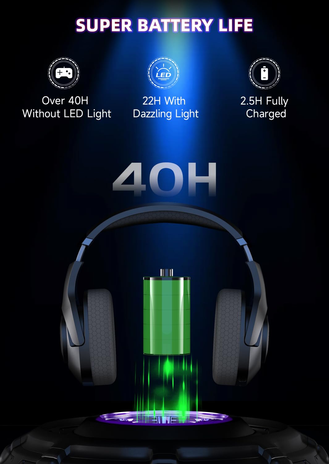 - Battery Life of 40 Hours: With this wireless PS5 headset with microphone, you can play continuously for up to 40 hours without having to charge the battery. The PC headset has a battery life of 25 hours when the RGB light is switched off. If the battery charge falls below 3%, a voice alarm will sound. Charging the headset takes only 2.5 hours until it is fully charged