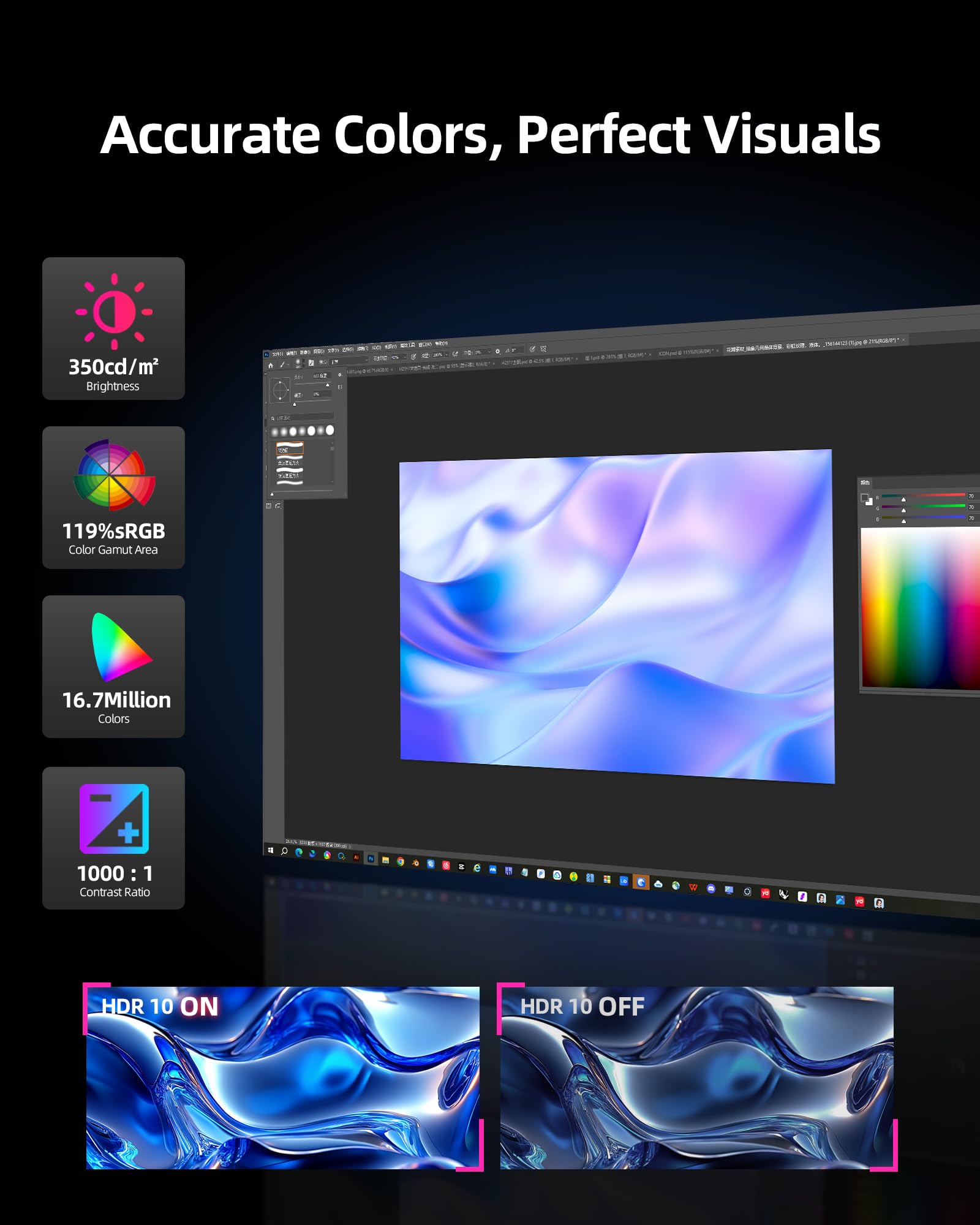 Text clarity is good, though not exceptional. At typical viewing distances (50-70cm), text is sharp enough for extended reading and productivity work. I spent several days using this as my primary work monitor, writing reviews and editing spreadsheets, without any eye strain or readability issues. The resolution provides enough screen real estate to have two browser windows side-by-side comfortably.
