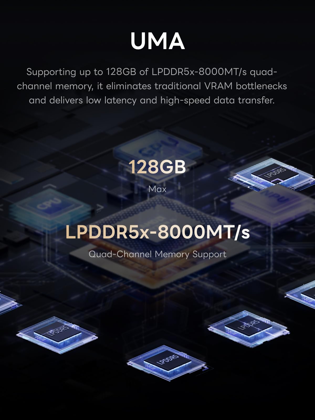- 【128GB UMA Memory】Equipped with up to 128GB of LPDDR5x-8000MT/s unified memory, it enables the CPU and GPU to access a shared, high-bandwidth memory pool with extremely low latency. Ideal for large-scale AI inference, 3D workloads, and complex timelines in video editing. It eliminates traditional VRAM bottlenecks, ensuring smoother data transfer during high-intensity computations. The UMA design maximizes performance stability under high loads