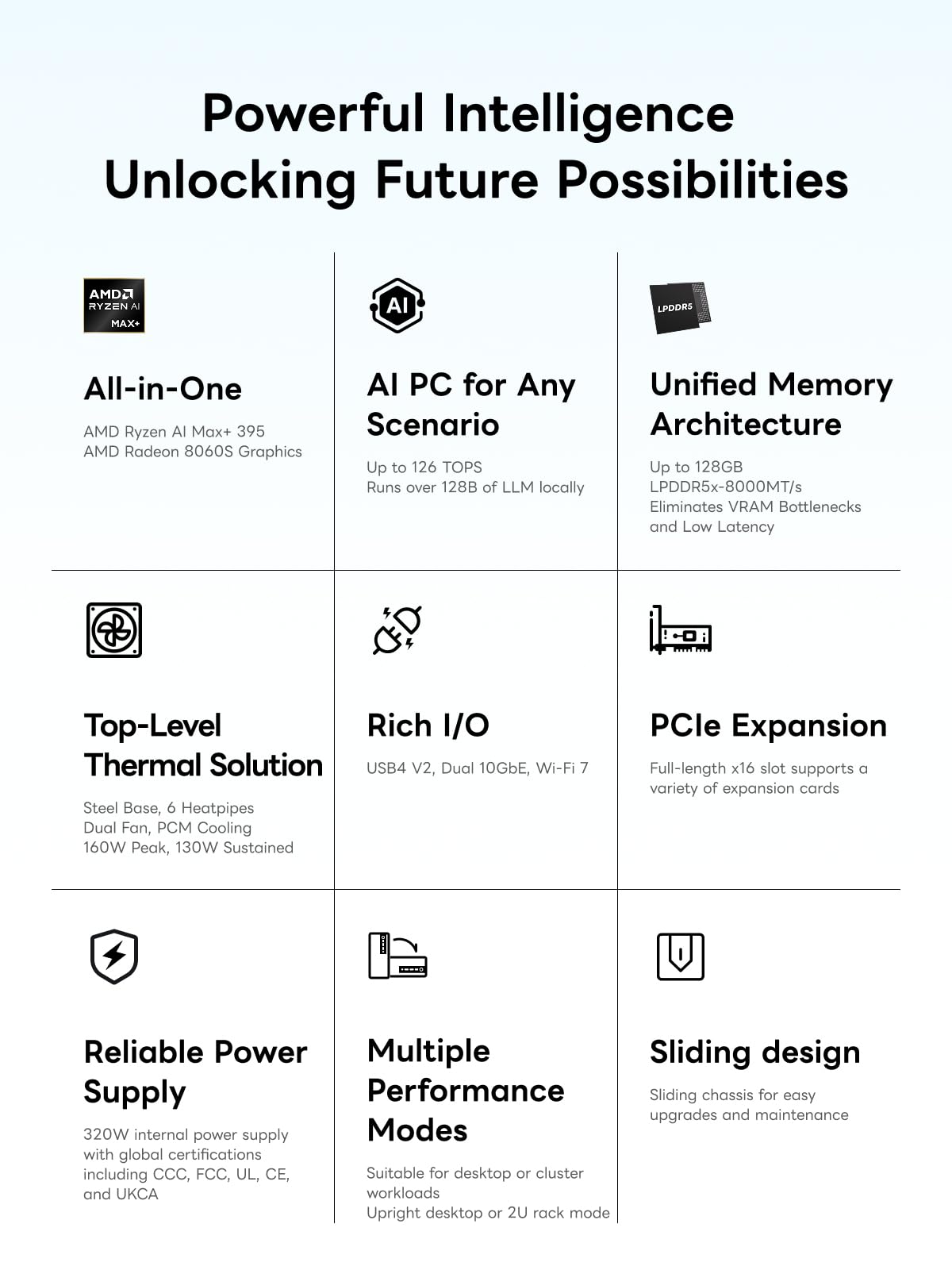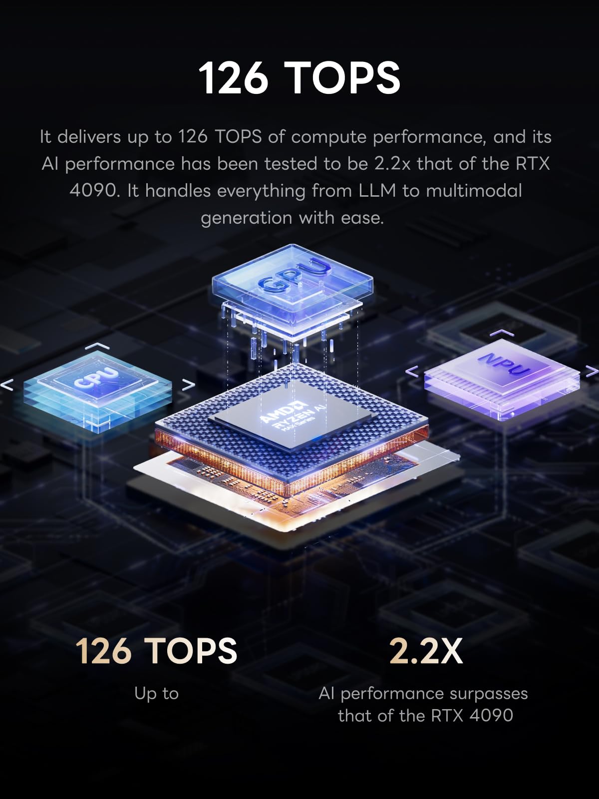 - 【High-Performance APU】The MS-S1 MAX features an AMD Ryzen AI Max+ 395 APU, integrating a Zen 5 architecture CPU (up to 5.1GHz, 16C/32T, 64M L3 Cache), an RDNA 3.5 GPU, and an NPU (50 TOPS). The total system output is 126 TOPS. It provides powerful parallel computing capabilities for demanding AI workflows. It is ideal for running local LLMs, multimodal models, and computationally intensive tasks