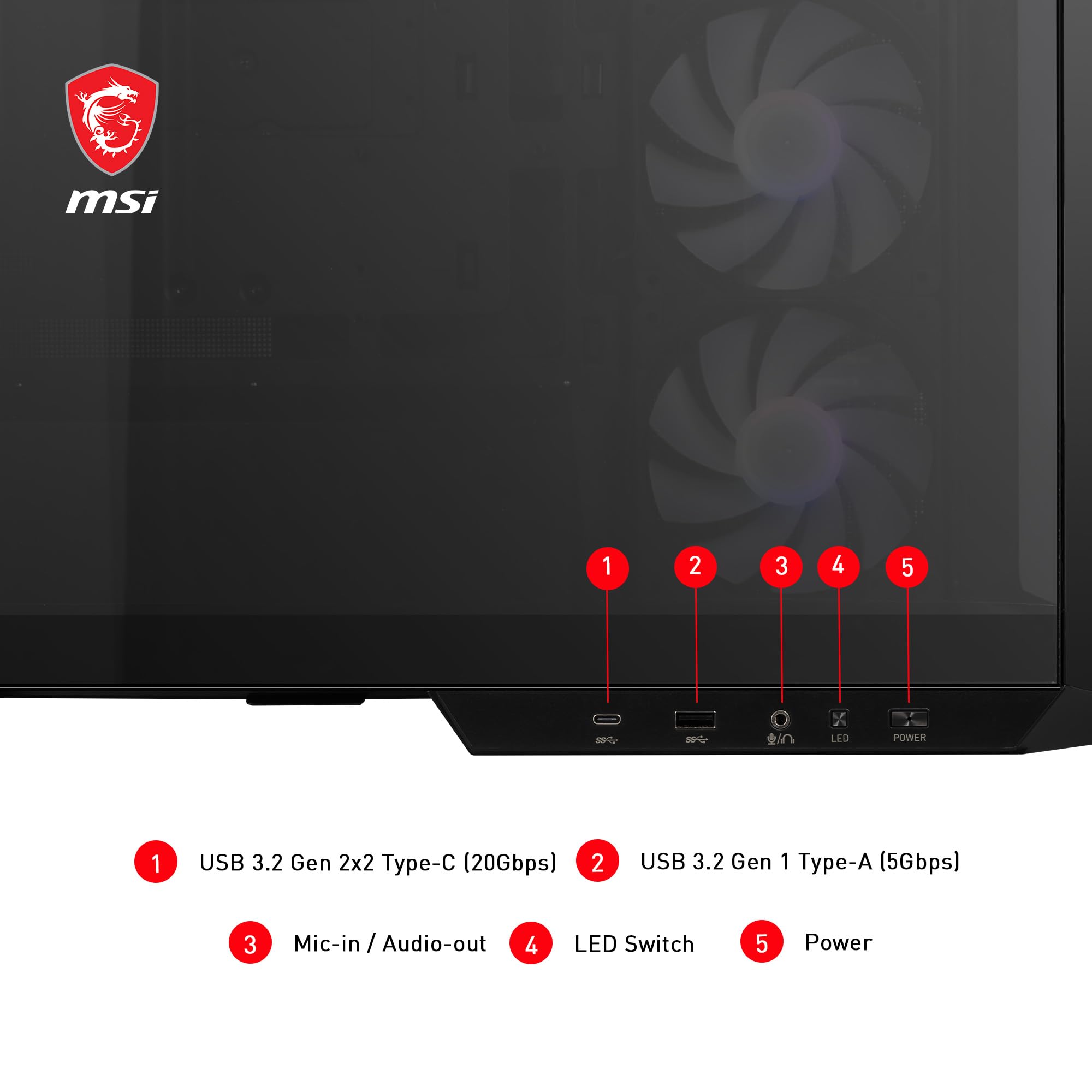 - INSTA-LIGHT I/O control panel β The I/O panel contains a power and LED switch, microphone/audio ports, a USB 3.2 generation 2x2 Type-C (20Gbps) and a USB 3.2 generation 1 Type-A (5Gbps) port