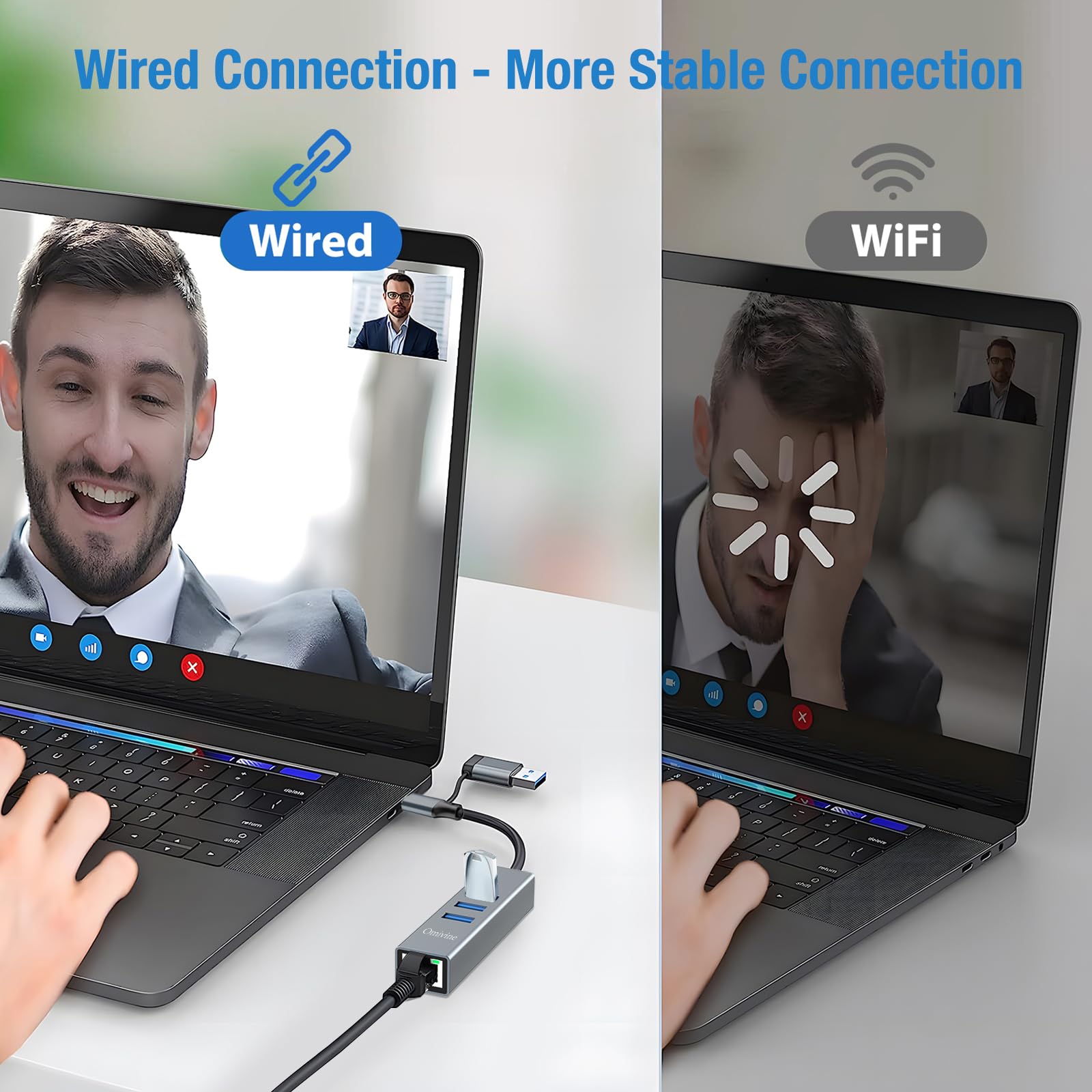 - 4-In-2 USB Ethernet Hub - Omivine 4-in-2 USB to Ethernet Adapter converts USB-A and USB-C ports to 1 * RJ45 1000 Mbps Ethernet port and 3 * USB 3.0 ports, compatible with USB-A and USB-C port laptops. It solves the problem of insufficient laptop ports, provides a stable and reliable wired connection. It can help to achieve faster file transfer and smoother network connection.