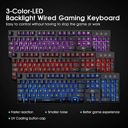 Rii RK108 Gaming Keyboard and Mouse Set,Wired LED Light Up Keyboard Mouse with 3 Colors Backlit (Red/Purple/Blue),Compatible with PC,Laptop,Windows,Gamer,Xbox one,PS4,PS5-UK Layout