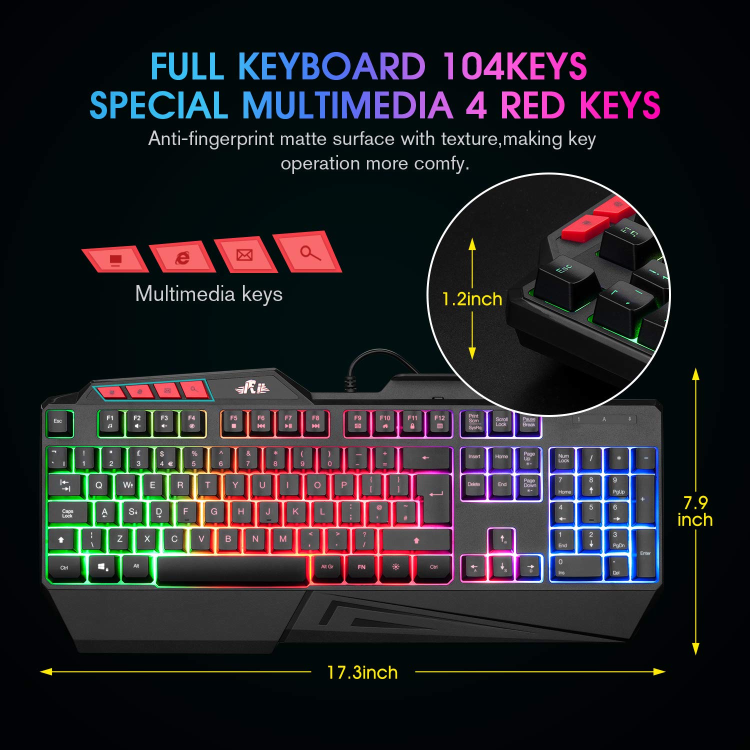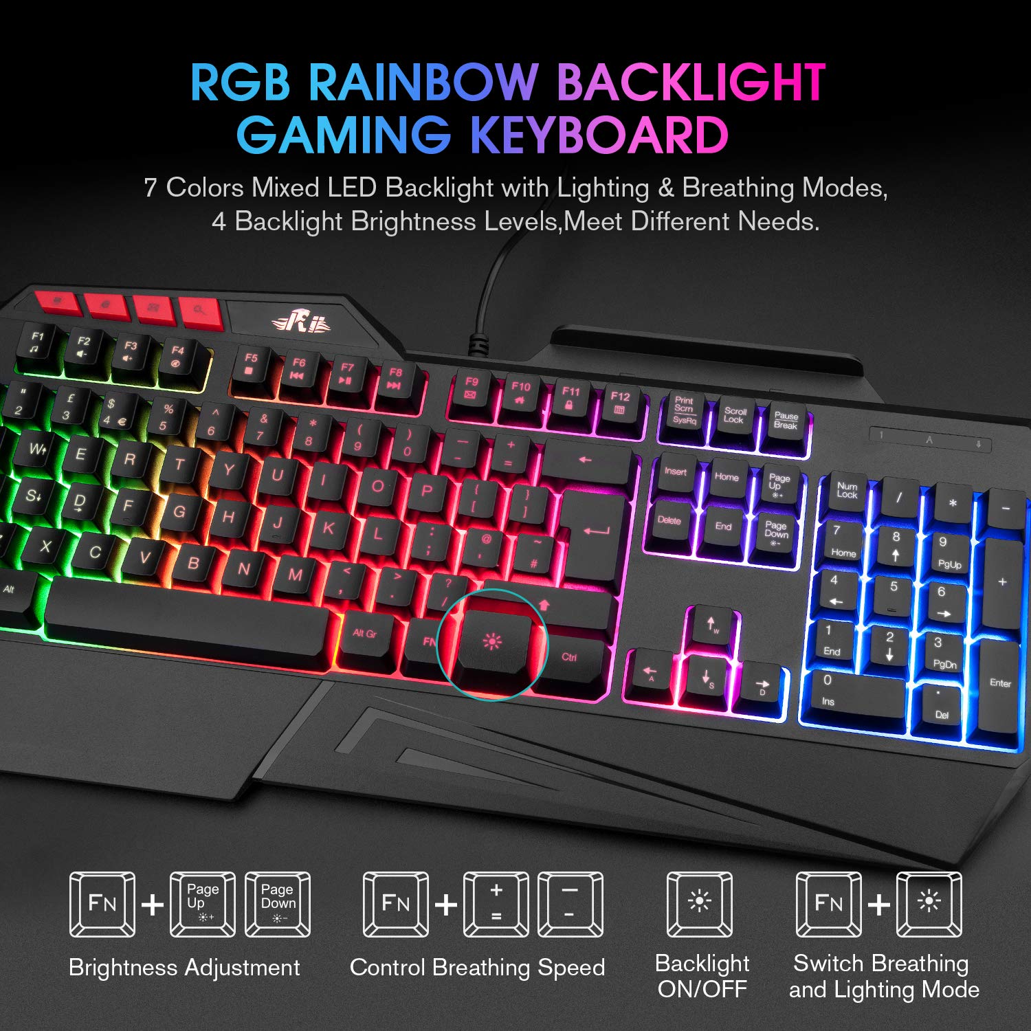 - 【Durable & Easy to Use】Rii rainbow backlit led keyboard with anti-fading keys can withstand 50 million presses. Support plug and play, it is compatible with PC gamer Windows 95/98/XP/2000/ME/VISTA/7/8/10/Mac OS/Xbox one/PS4/PS5.