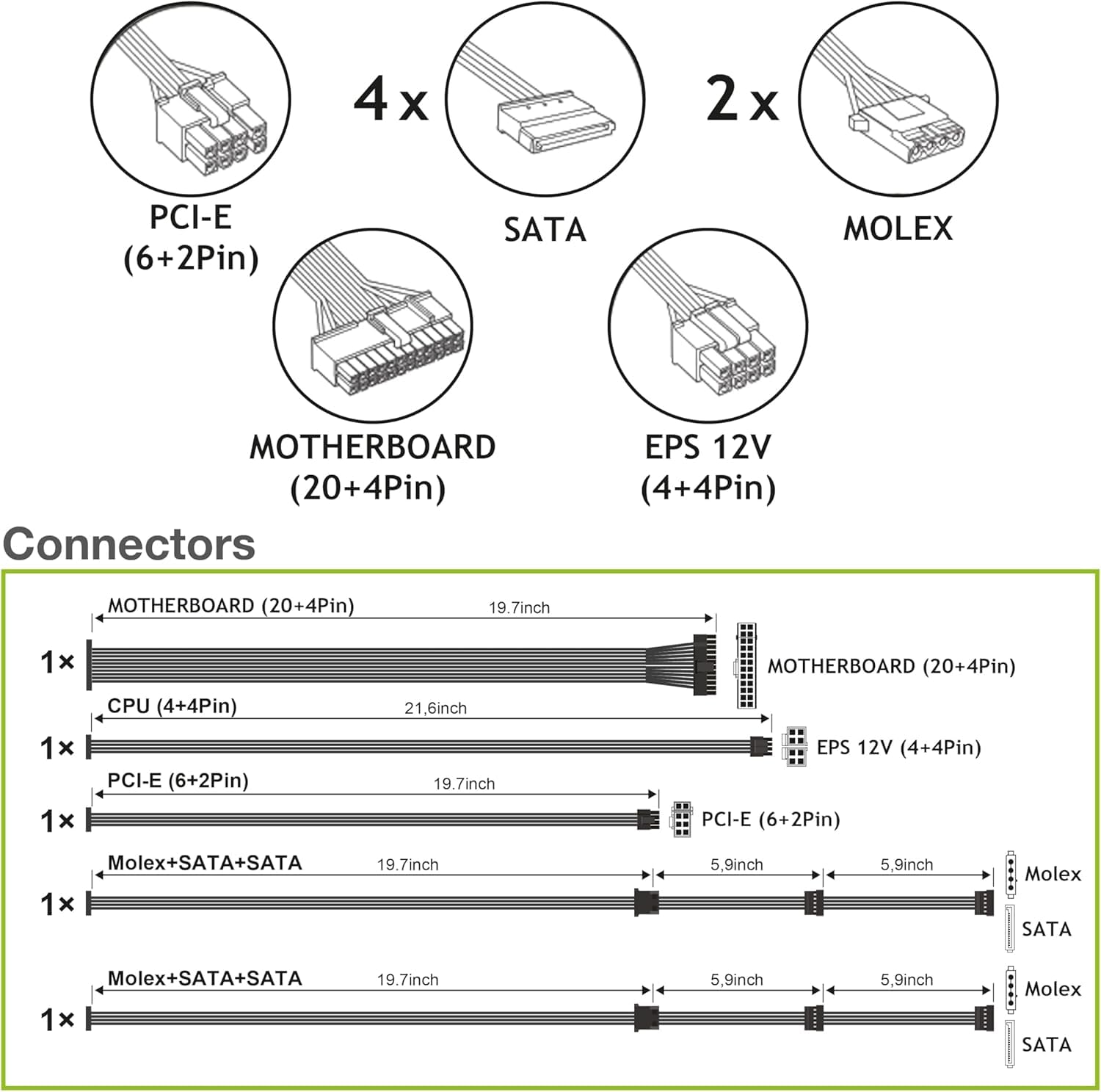 - COMPREHENSIVE CONNECTORS FOR EVERY NEED: Equipped with 1 20+4 pin connector, 1 12V 4+4 pin connector, 1 PCI-E 6+2 pin connector, 4 SATA connectors, and 2 Molex connectors, providing reliable support for motherboards and advanced components.