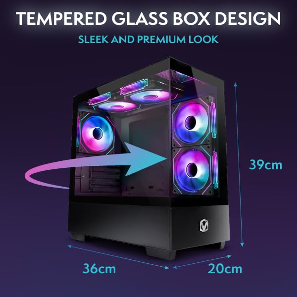 The Vibox V Gaming PC ships in a black mid-tower case with tempered glass side panel and RGB lighting, hitting all the expected “gaming PC” aesthetic notes. Build quality is functional rather than premium, with thin steel panels and basic cable management.