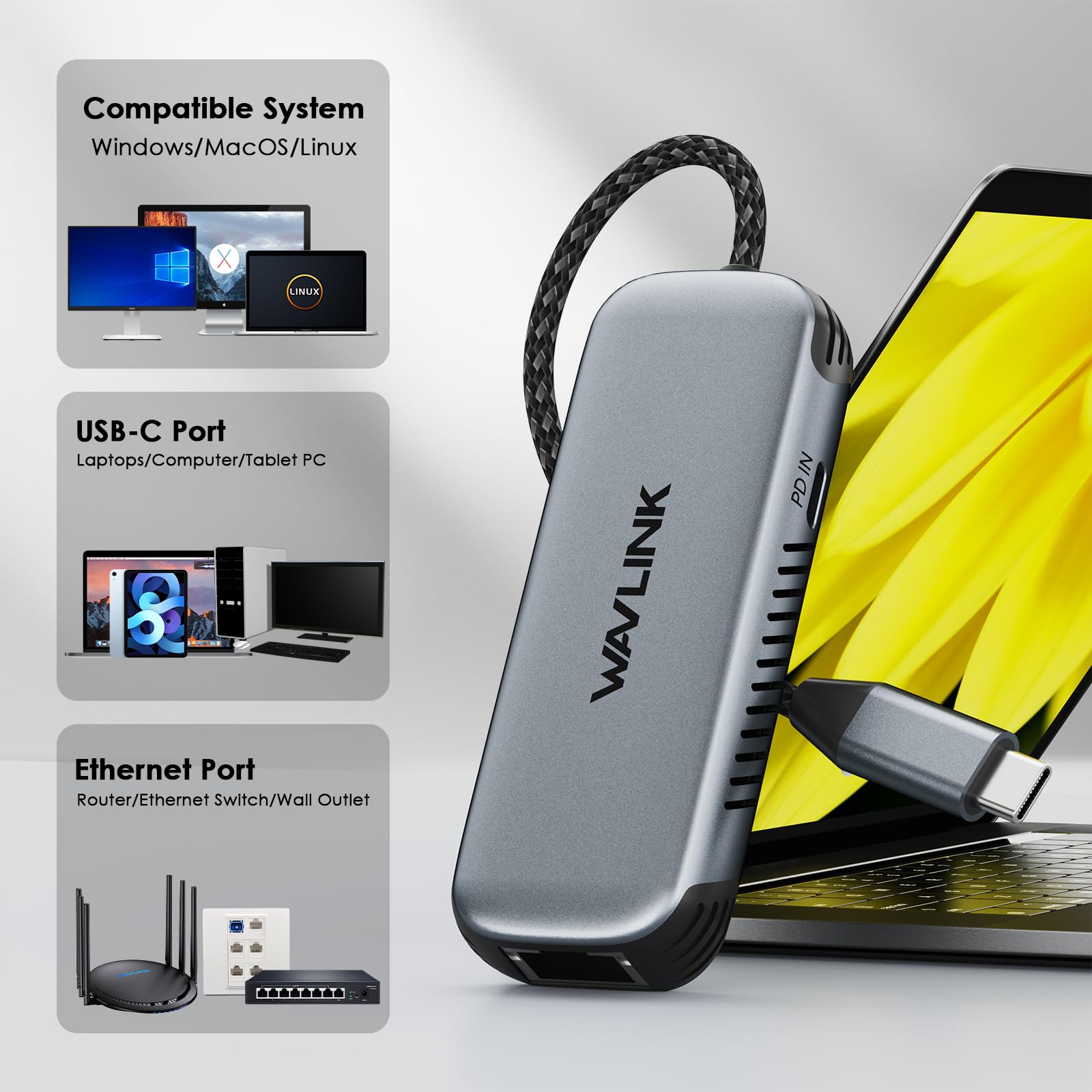 WAVLINK USB C to Ethernet Adapter with 95W PD, 5Gbps USB3.0/USB C RJ45 Ethernet Network Adapter for Laptops, Computers, Compatible with Windows 10/11, Mac OS 11 or Later, Linux and More